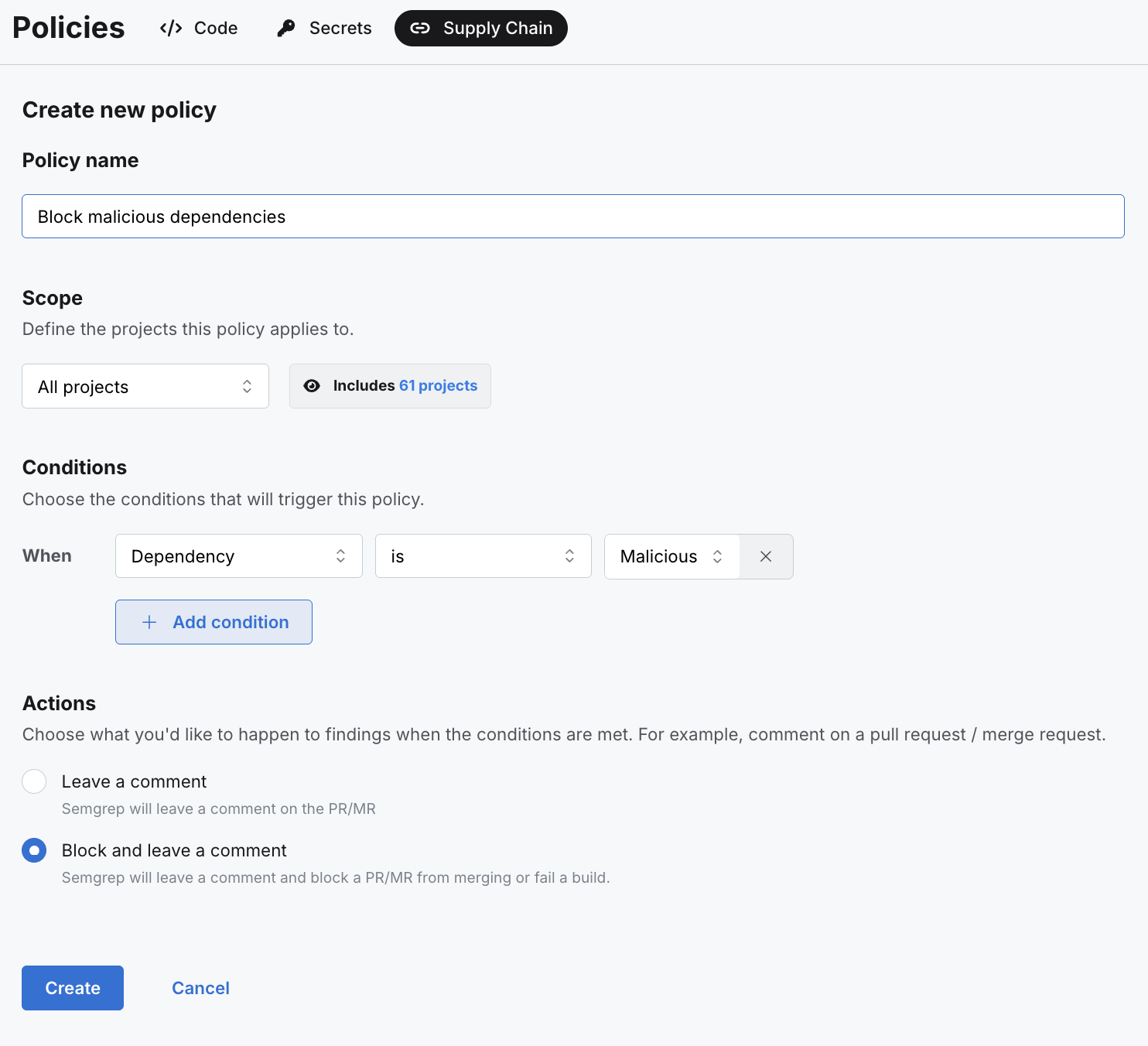 The introduction of malicious dependency detection as a generally available feature for all Semgrep Supply Chain customers is a major step forward that covers a serious gap among many teams. But the repeated attacks over the last few months ominously point to a new normal where embedded malignant packages can wreak havoc on organizations. So Semgrep will continue to invest in this area with the aim of making future attacks as pain-free for our customers as possible. For more information on how to configure policies, as well as incident response guidelines, check out the docs page.