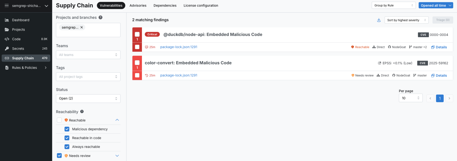 Basically, once the rule got published, Semgrep Supply Chain users could see findings from malicious dependencies in the Dependencies tab, and the rules for those malicious dependencies in the Advisories tab. AppSec teams were able to filter specifically for malicious dependency findings or for security advisories related to malicious dependencies.