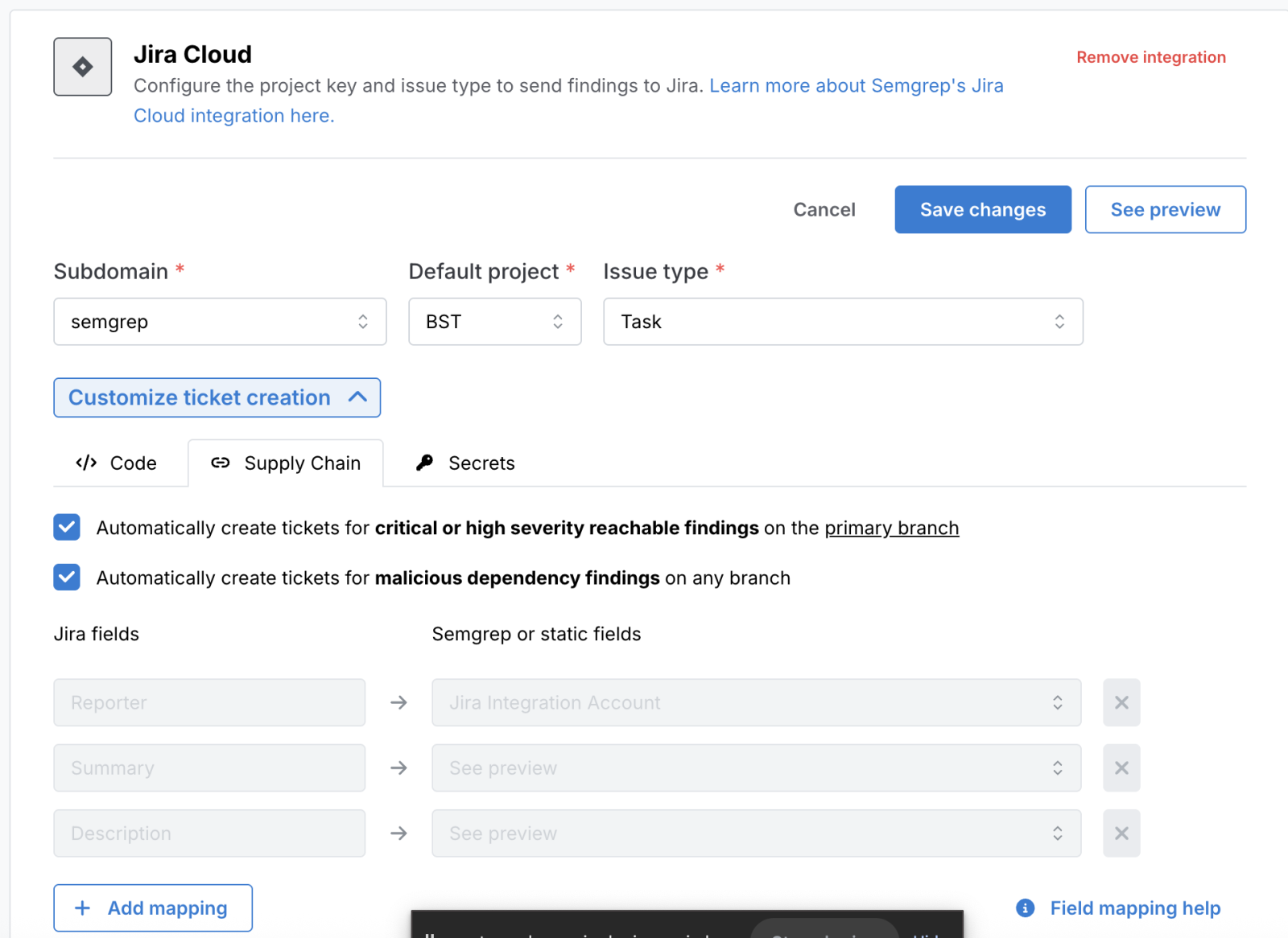 While typical vulnerabilities only really matter on the main branch, malicious package findings are almost always critical, and thus need to be prioritized even on non-primary branches. As an extension of our Jira integration, Semgrep Supply Chain customers will now get a dedicated checkbox to create tickets for malicious dependencies on any branch, helping security teams quickly review incoming automated findings on their Jira board, and set the correct priority and assignee before the development team even sees them.