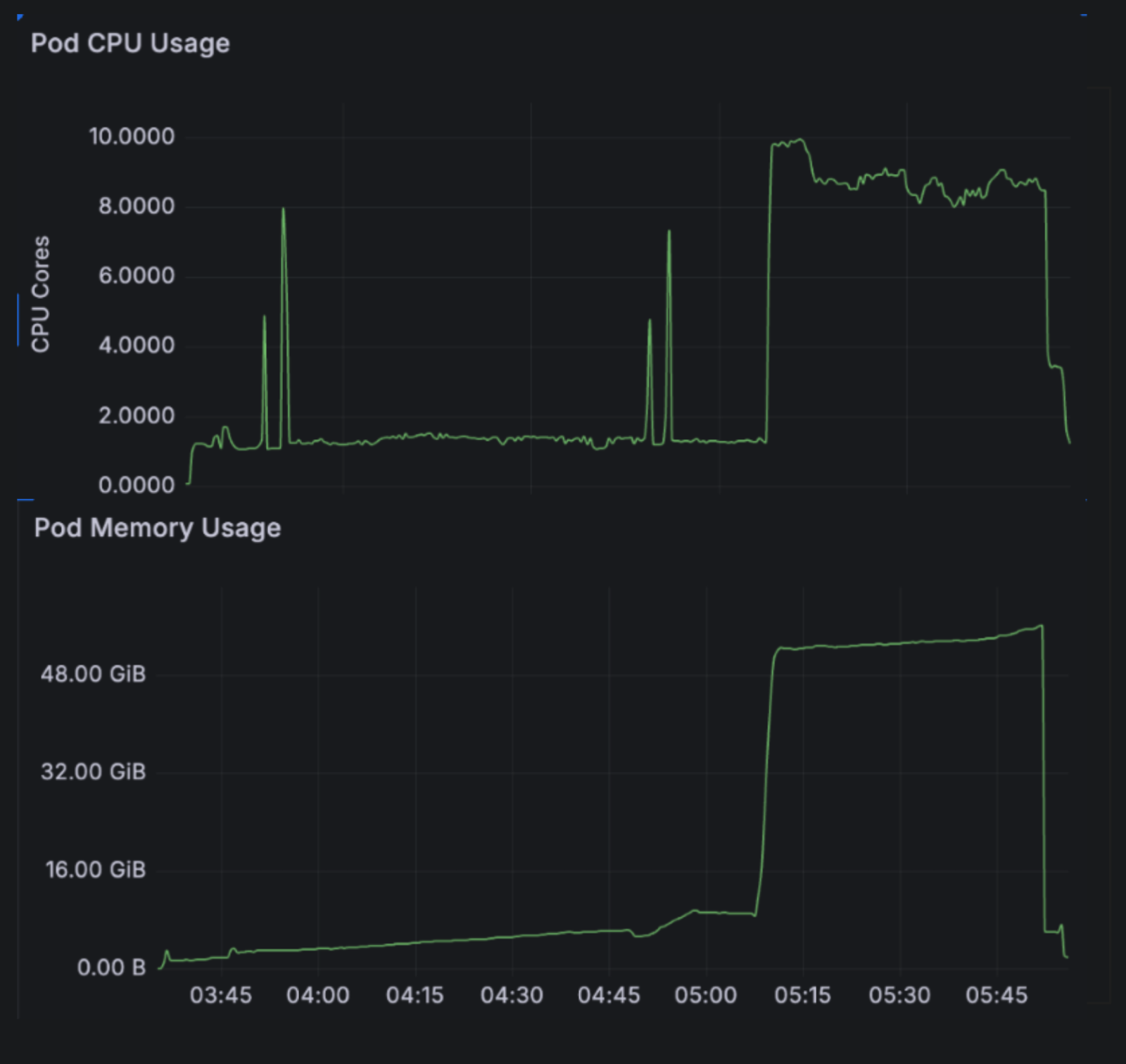This Grafana chart shows CPU and memory utilization for a benchmark repository. With each distinct process, we add a new memory heap as the OCaml collector kicks in to induce a copy. The resident memory usage is directly proportional to the number of threads. For a deeper technical understanding, it is the impact of the garbage collector within each process that results in periodic big spikes and then a leveling off.