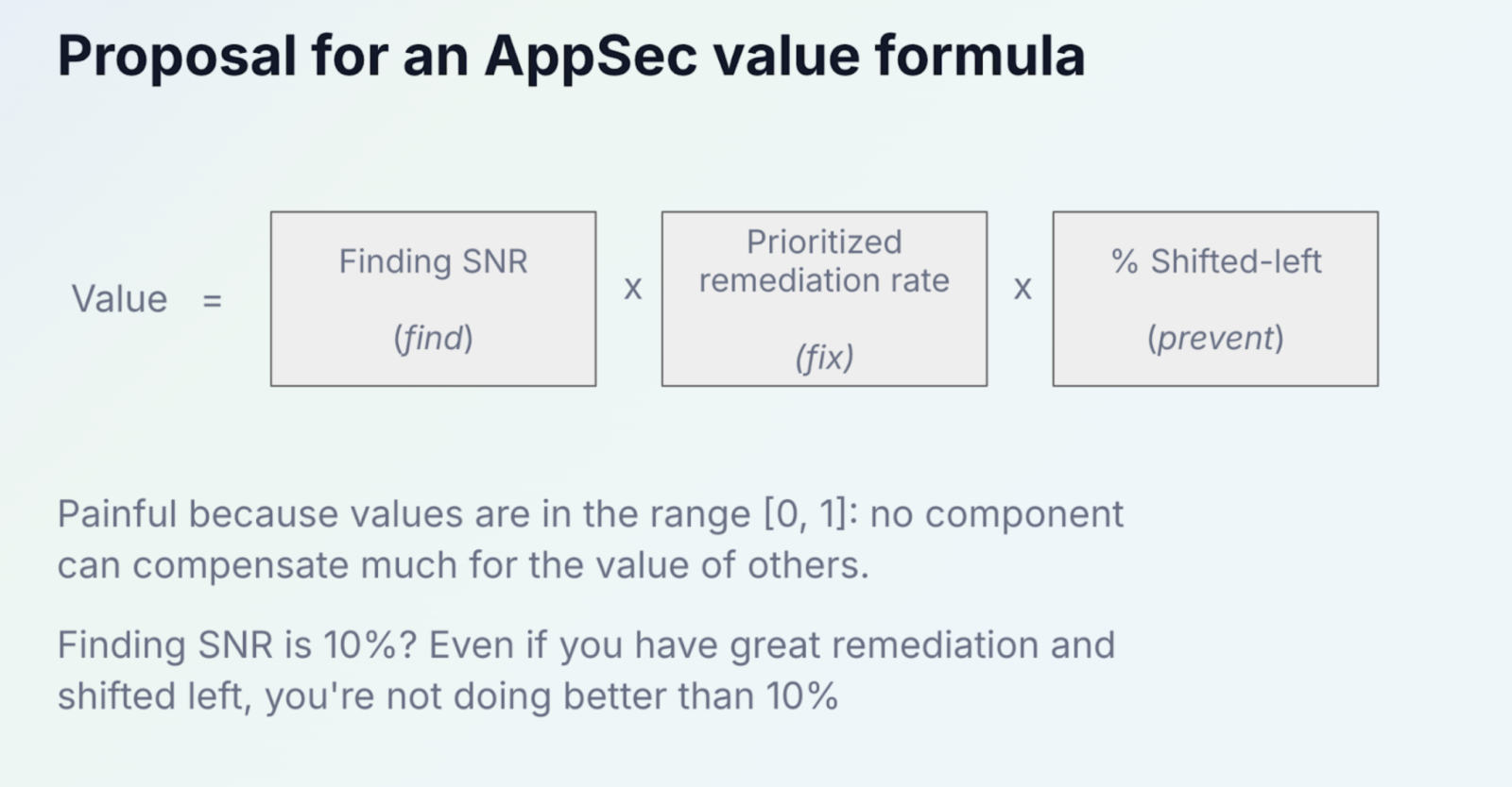 What changed for me in 2024 was realizing that LLMs could change the game in the context of the findings engine itself. Even with great remediation, you're limited by the signal-to-noise ratio (SNR) of the scanner. Here's my napkin formula:
