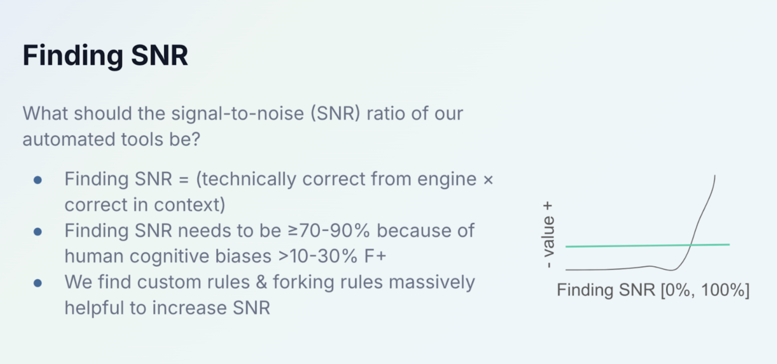 So concretely, what's the value of customization? Finding SNR. Finding SNR needs to be ≥70-90% because of human cognitive biases: above 10-30% false positives engineers tune out:, even a true positive preceded by a false positive will lead to a cascading perception of false positives. So an AppSec scanner can definitely have negative value (!) below a certain SNR. See napkin sketch: