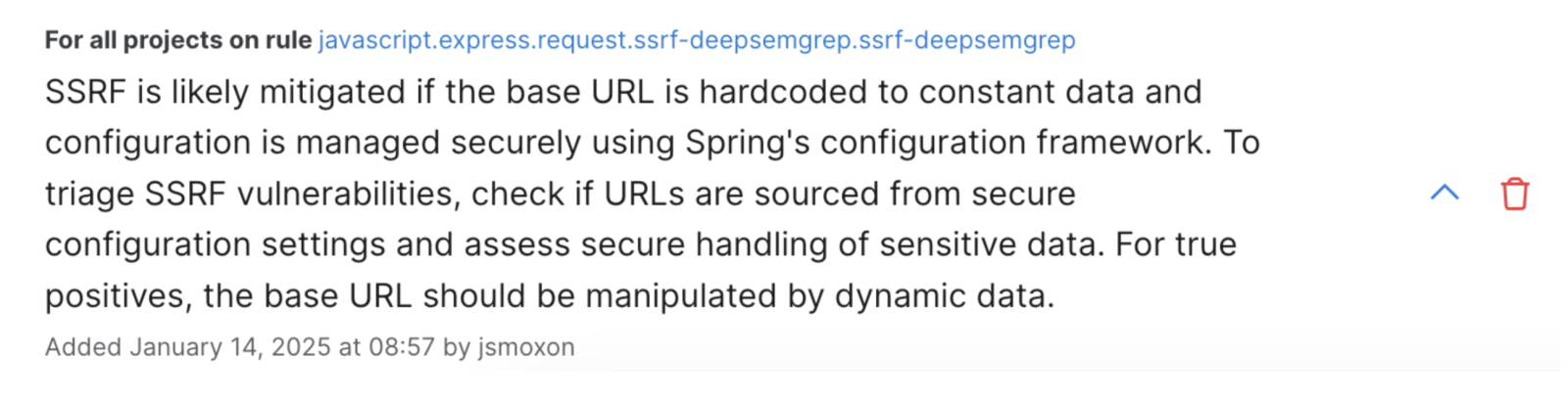 While triaging, one private beta user found that a large number of the server-side request forgery (SSRF) findings that Semgrep identified, while valid pattern matches, were actually mitigated by context about their internal services that SAST tools would never have (without custom rule writing).